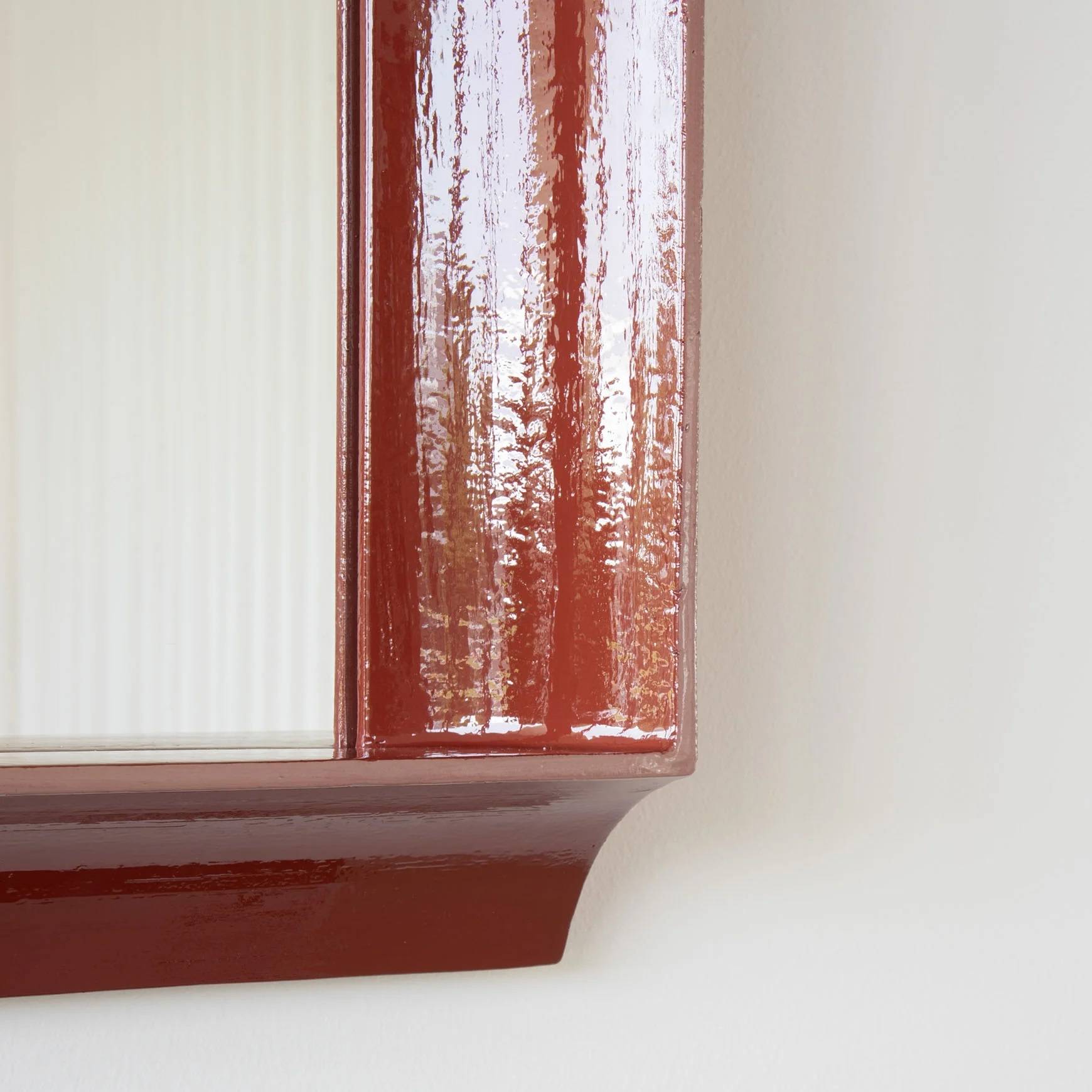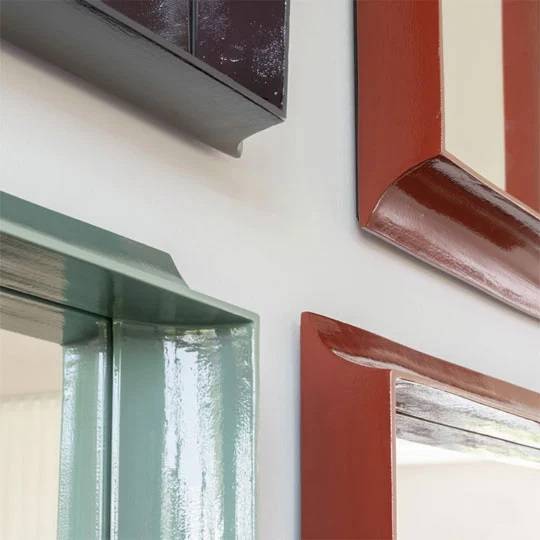 Spiegels verkrijgbaar in 3 verschillende afmetingen (60x60 cm, 60x80 cm, 80x60 cm) en kleuren (salie, aubergine, terracotta). Frame van geëxtrudeerd keramiek, koud gelakt. Spiegel met beschermend aluminium achterpaneel.