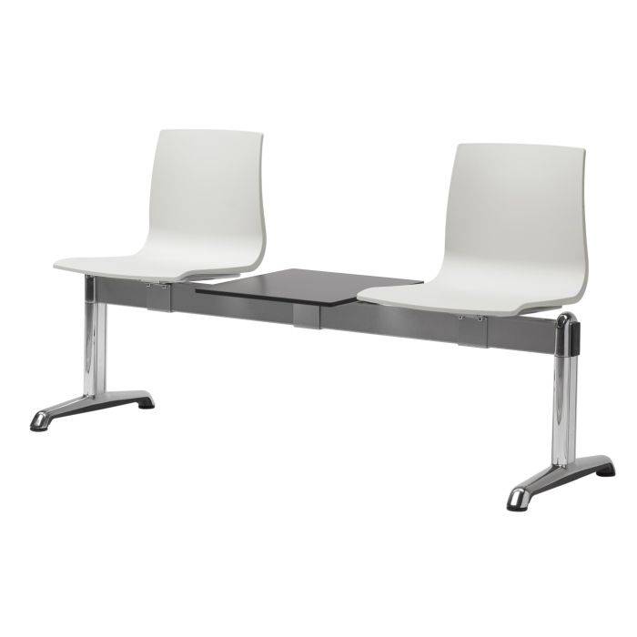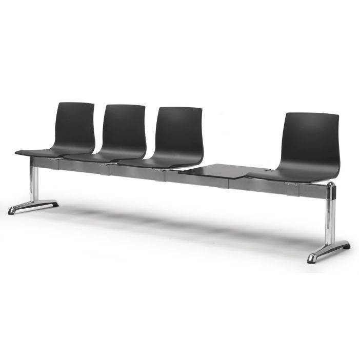 De zittingen zijn gemaakt van brandvertragend technopolymeer. Gecoat stalen frame. Gepolijste aluminium poten. Zwart HPL tafelblad, op elke gewenste positie te monteren