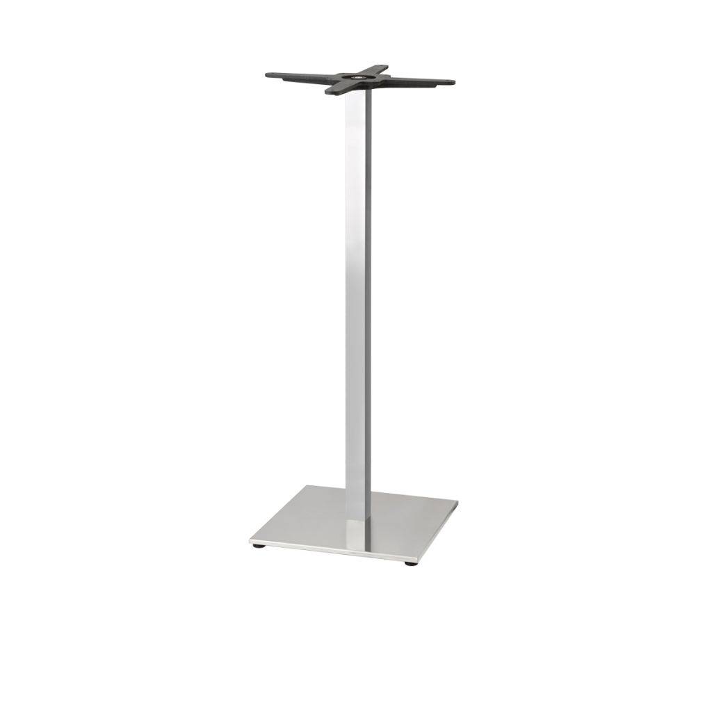 Serie tafelonderstellen van SCAB met vierkante voet en kolom, verkrijgbaar in verschillende afwerkingen zoals gepolijst roestvrij staal, gesatineerd messing-effect, gecoat zwart staal of cortenstaal-effect.