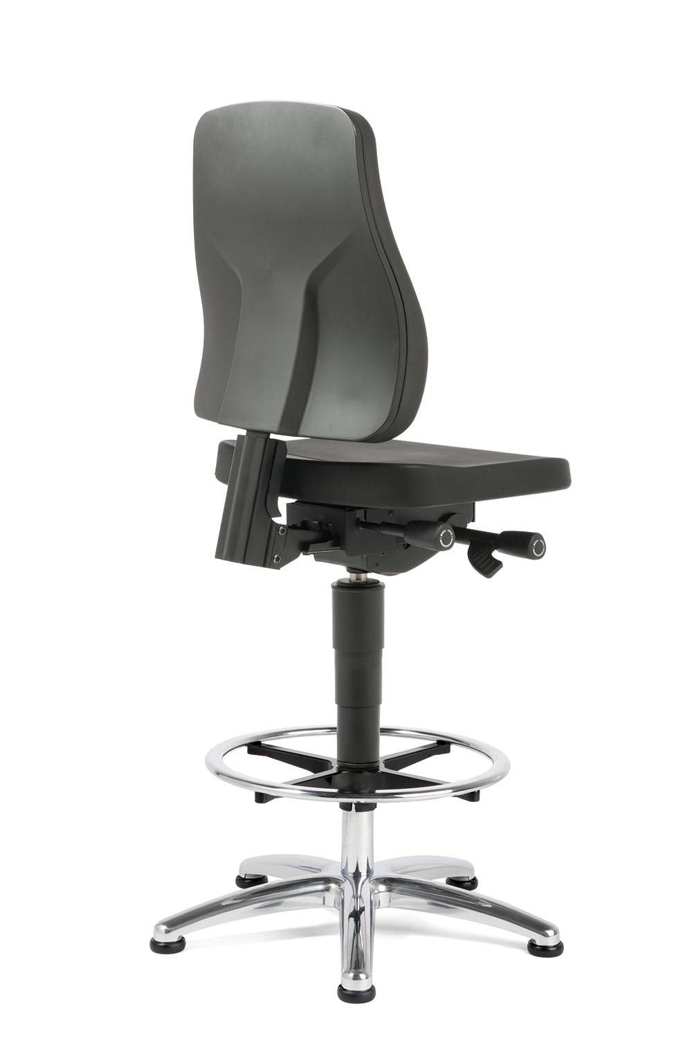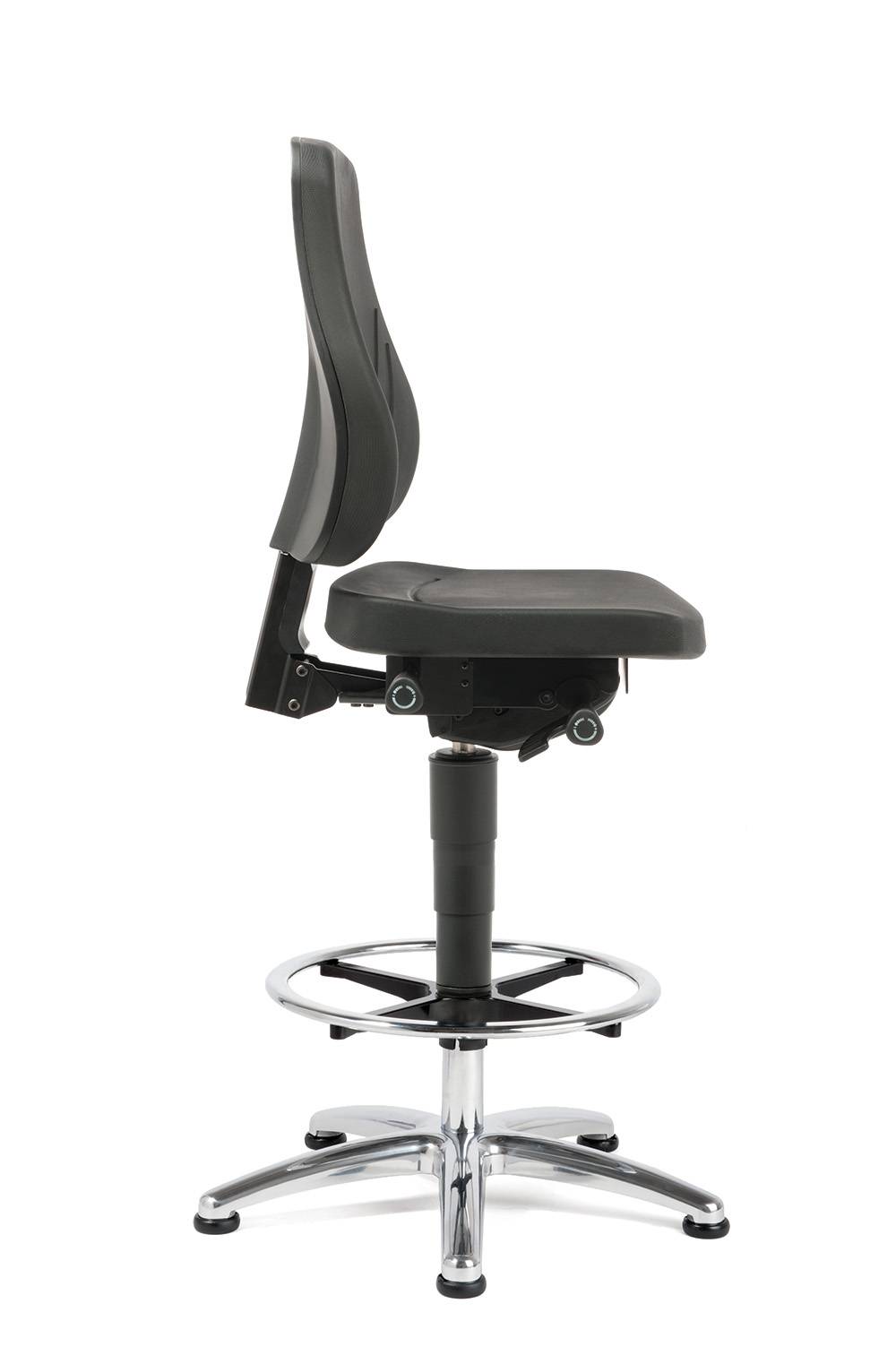 Rugleuning en zitting gestoffeerd PUR, achterzijde kunststof zwart, hoogteverstelling van de rugleuning, zitneig-verstelling, voetkruis aluminium gepolijst met voetenring, kunststof glijders, zithoogte 62-90cm .